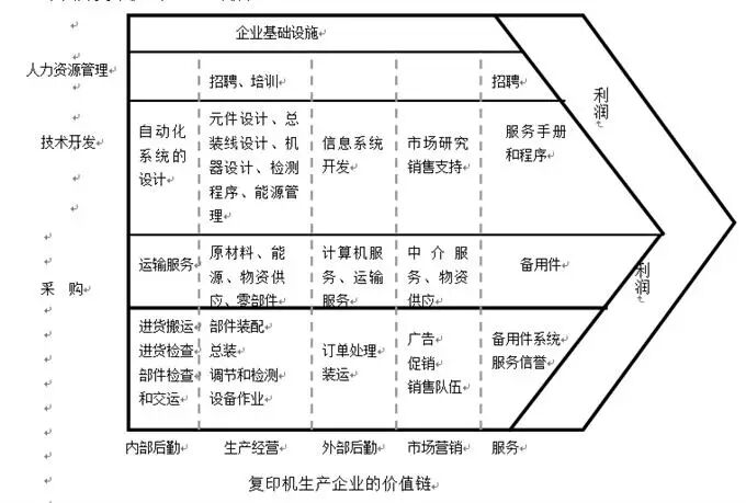 价值链的框架是将链条从基础材料到最终用户分解为独立工序,以理解成本行为和差异来源。通过分析每道工序系统的成本、收入和价值,业务部门可以获得成本差异、累计优势。下图为复印机生产企业的价值链。