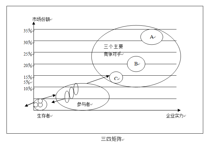 “三四规则”只是从经验中得出的一种假设,它并没有经过严格的证明。但是这个规则的意义非常重要,那就是:在经验曲线的效应下,成本是市场份额的函数。倘若两个竞争者拥有几乎相同的市场份额,那么,谁能提高相对市场份额,谁就能同时取得在产量和成本两个方面的增长;与所付出的代价相比,得到的可能会更多。但是对市场竞争的领先者而言,可能得到的好处却反而少了。然而在任何主要竞争者的激烈争夺情况下,最有可能受到伤害的却是市场中最弱下的生存者。